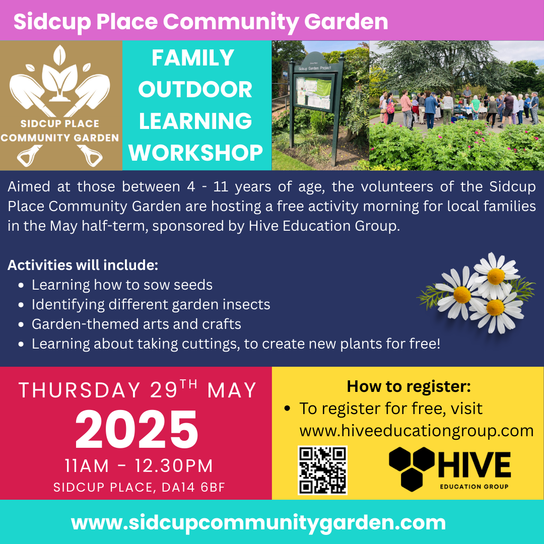 A free of charge family fun event at the Sidcup Place Community Garden, sponsored by Hive Education Group. Launched 10 years ago, the Sidcup Garden Project sought to restore this once loved public garden back to its former glory. Volunteers continue to maintain the space, which has won countless awards over the past decade. Keen to promote nature and interaction with horticulture amongst the younger generation, volunteers are now hosting a free activity morning at the garden on Thursday 29th May 2025.